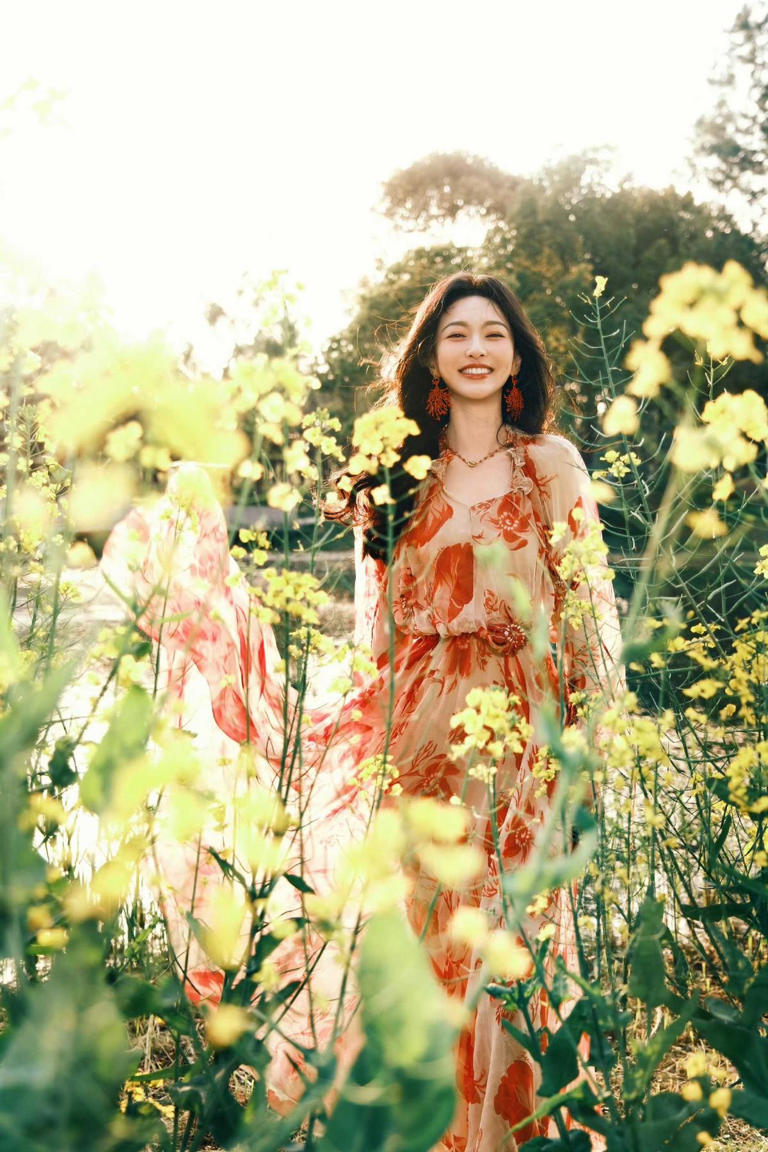 唐嫣的长发并未经过过于复杂的打理,而是以一种近乎自然的状态呈现。卷曲的弧度恰到好处,既不会显得过于凌乱,又能完美地修饰脸型,让整张脸看起来更加精致小巧。这样的发型,无疑是与长裙的最佳搭配,既突出了整体的浪漫氛围,又彰显了唐嫣的温柔气质。
