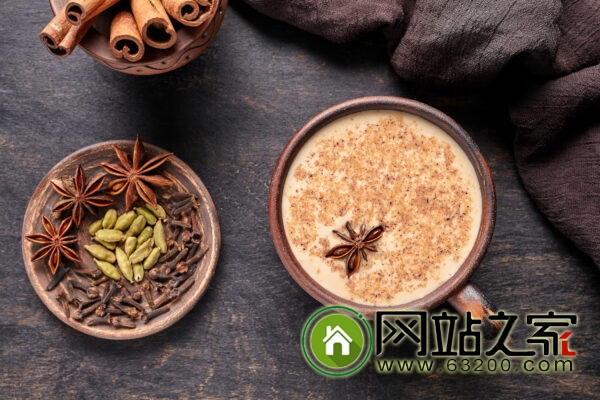 传统的印度香料奶茶(Masala tea chai latte)是由各种新鲜香料混合烹煮的奶茶,香料成分具有保健功效。小豆蔻也被加入奶茶中。